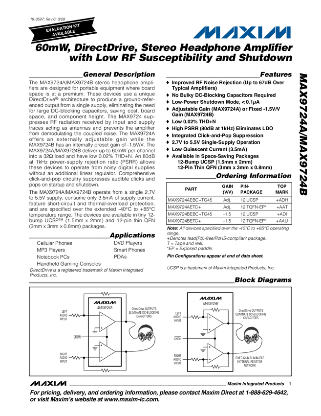 MAX9724A 60mW, DirectDrive, Stereo Headphone Amplifier with Low RF Susceptibility an...