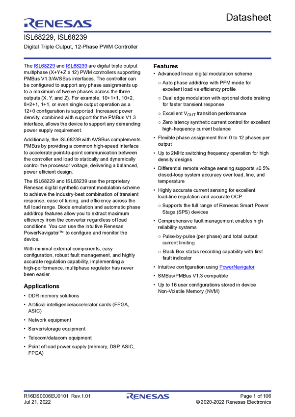 ISL68229 Digital Triple Output, 12-Phase PWM Controller