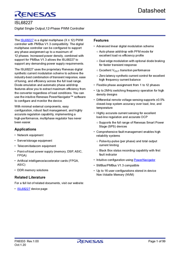 ISL68227 Digital Single Output,12-Phase PWM Controller