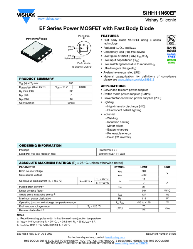 SiHH11N60EF EF Series Power MOSFET with Fast Body Diode