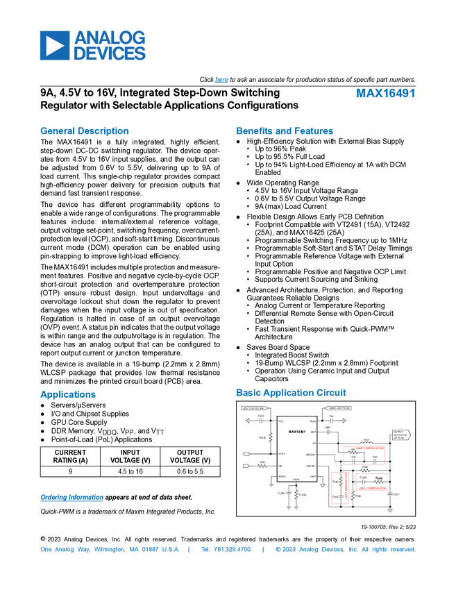 MAX16491 9A, 4.5V to 16V, Integrated Step-Down Switching Regulator with Selectable A...