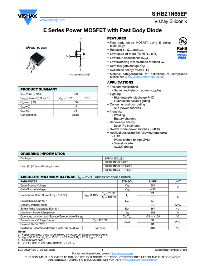 SiHB21N65EF E Series Power MOSFET with Fast Body Diode