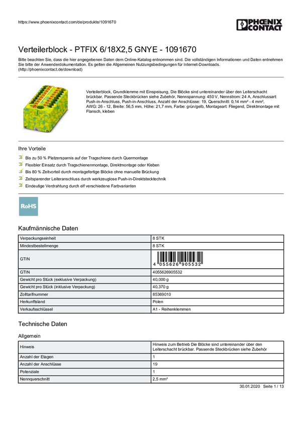 Blok rozdzielający Phoenix Contact PTFIX 6/18X2,5 GNYE 1091670, 8 szt.