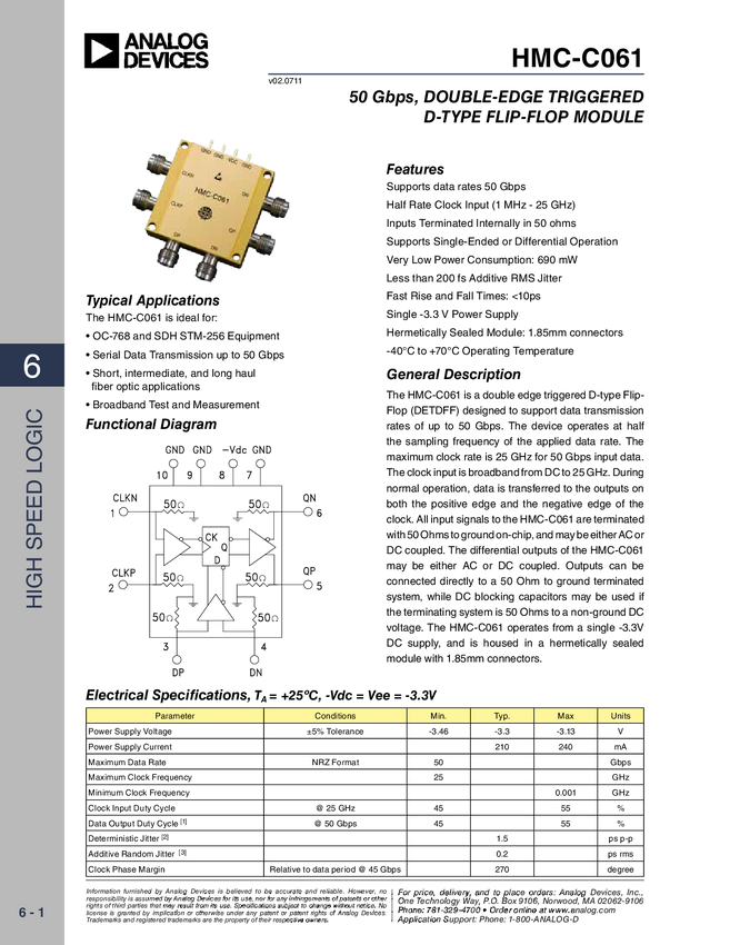 HMC-C061 50 Gbps, Double Edge Triggered D-Type Flip-Flop Module