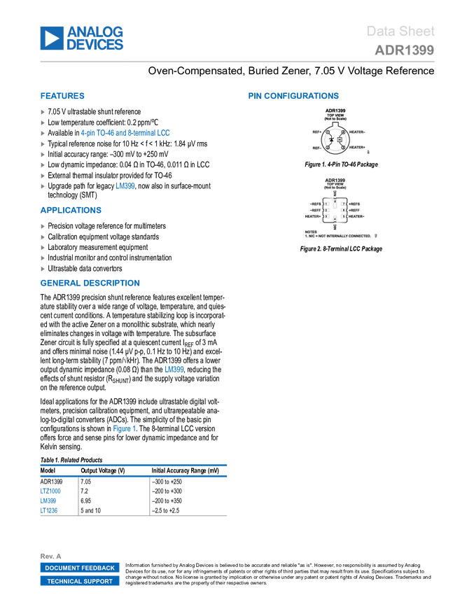 ADR1399 Oven-Compensated, Buried Zener, 7.05 V Voltage Reference