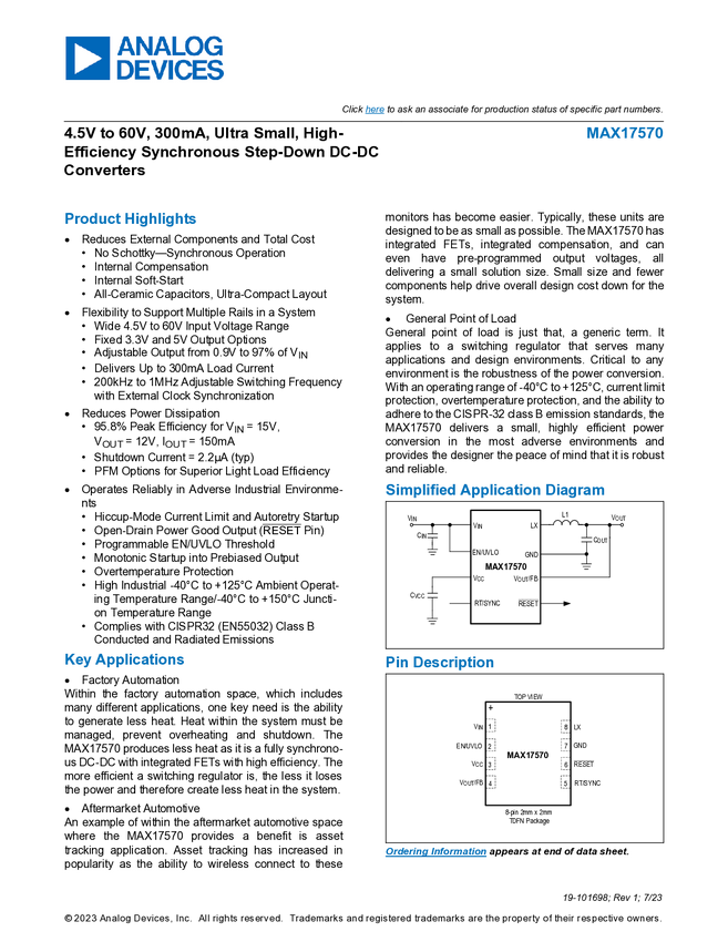 MAX17570 4.5V to 60V, 300mA, Ultra Small, High-Efficiency Synchronous Step-Down DC-D...