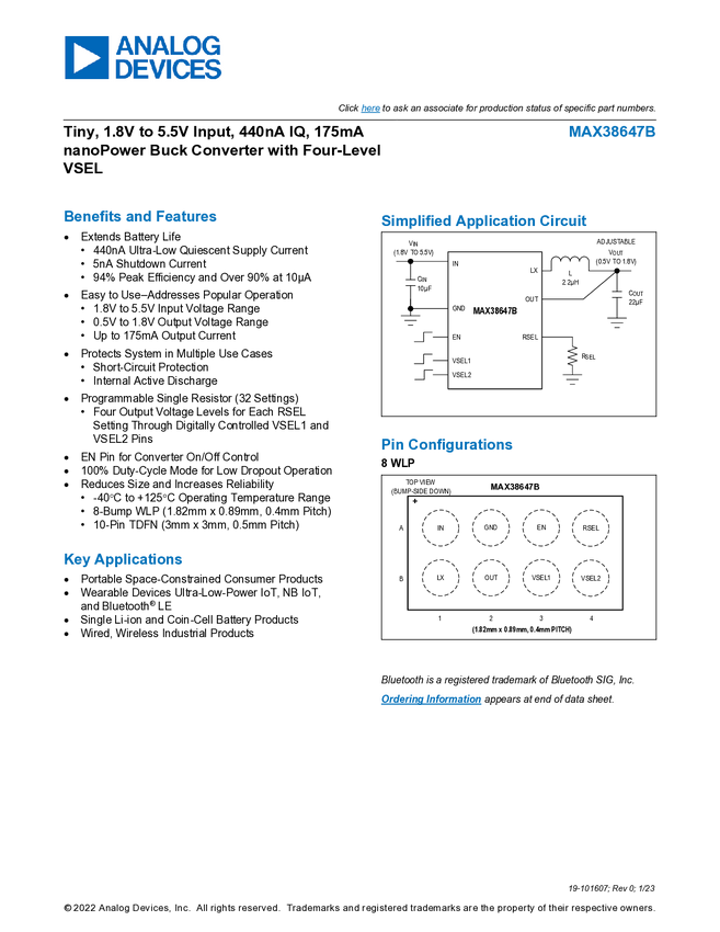 MAX38647B Tiny, 1.8V to 5.5V Input, 440nA IQ, 175mA nanoPower Buck Converter with Fou...