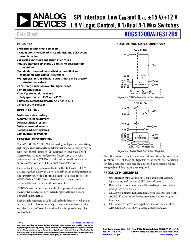 ADGS1208 SPI-Interface, Low C & Q, ±15V/+12V, 1.8V Logic Control, Dual 4:1 Muxes
