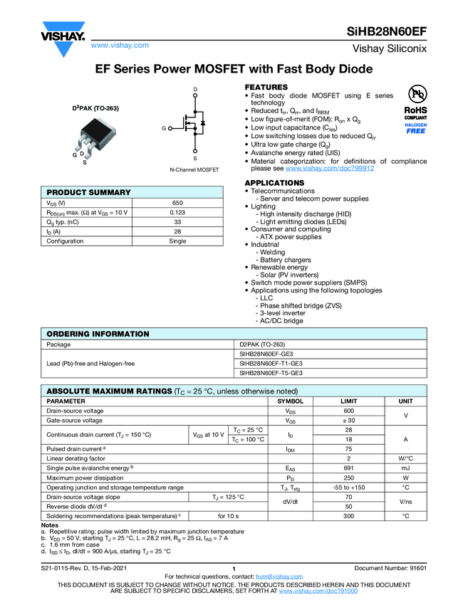 SiHB28N60EF EF Series Power MOSFET with Fast Body Diode
