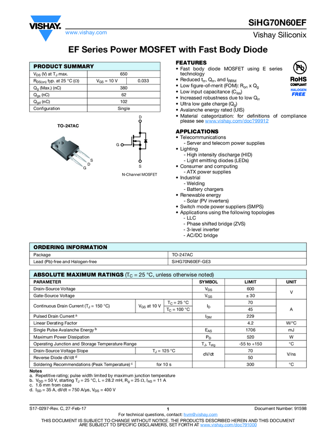 SiHG70N60EF EF Series Power MOSFET with Fast Body Diode