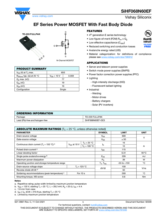 SiHF068N60EF EF Series Power MOSFET With Fast Body Diode