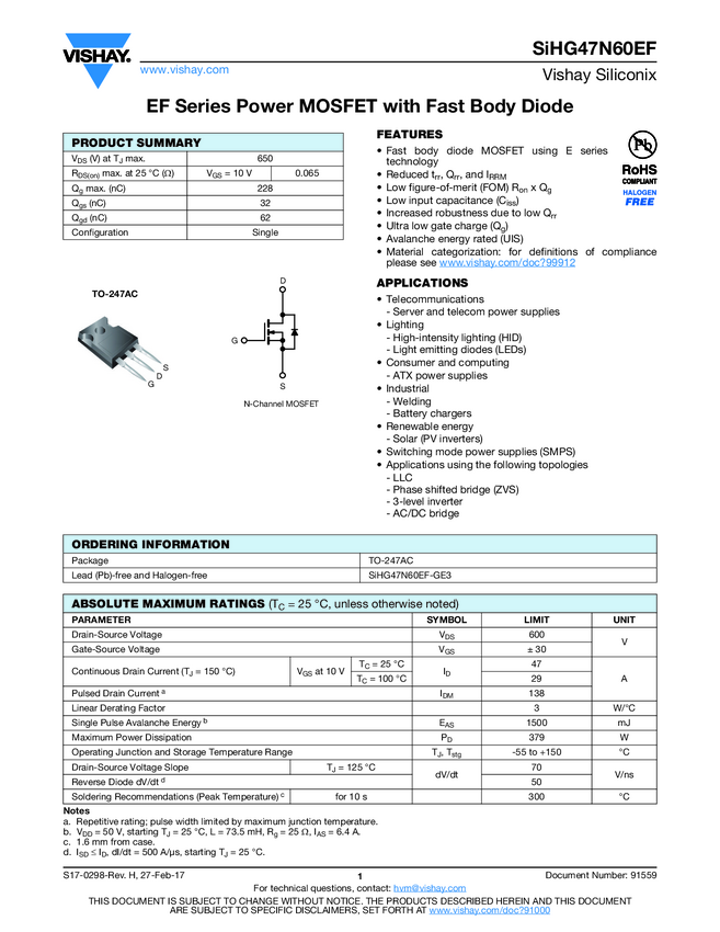 SiHG47N60EF EF Series Power MOSFET with Fast Body Diode