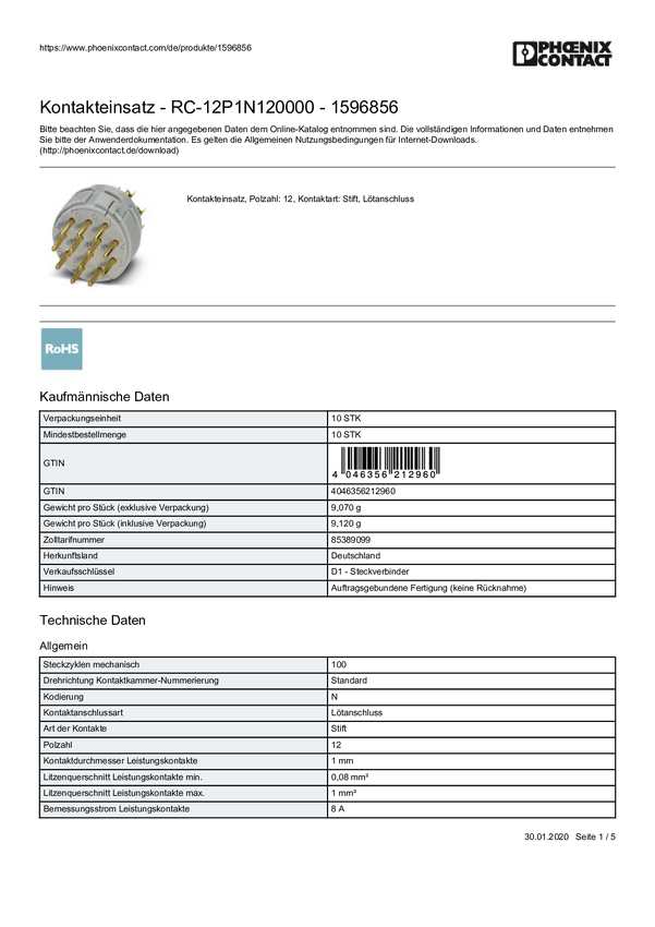 Złącze 1596856 RC-12P1N120000 Phoenix Contact Zawartość: 10 szt.