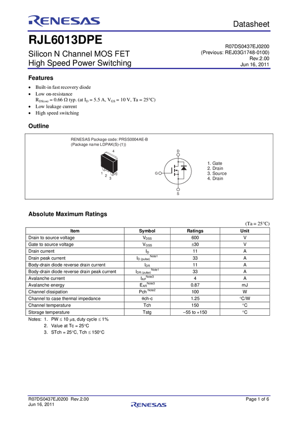 RJL6013DPE Nch Single Power Mosfet 600V 11A 810Mohm LDPAK(S)-(1)/To-263