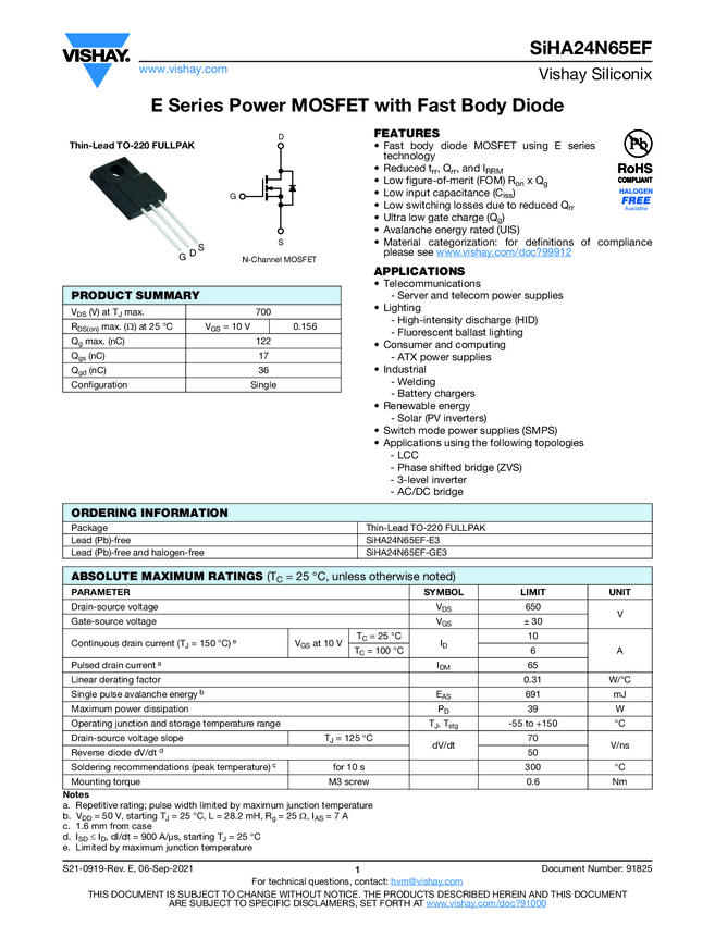 SiHA24N65EF E Series Power MOSFET with Fast Body Diode