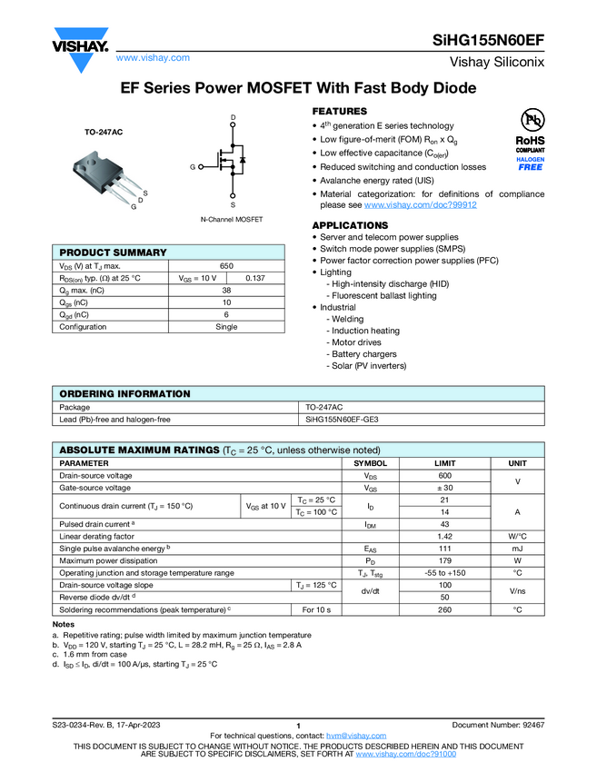 SiHG155N60EF EF Series Power MOSFET With Fast Body Diode