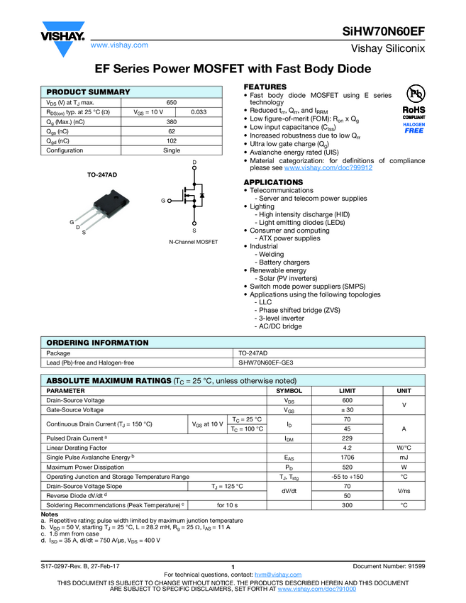 SiHW70N60EF EF Series Power MOSFET with Fast Body Diode