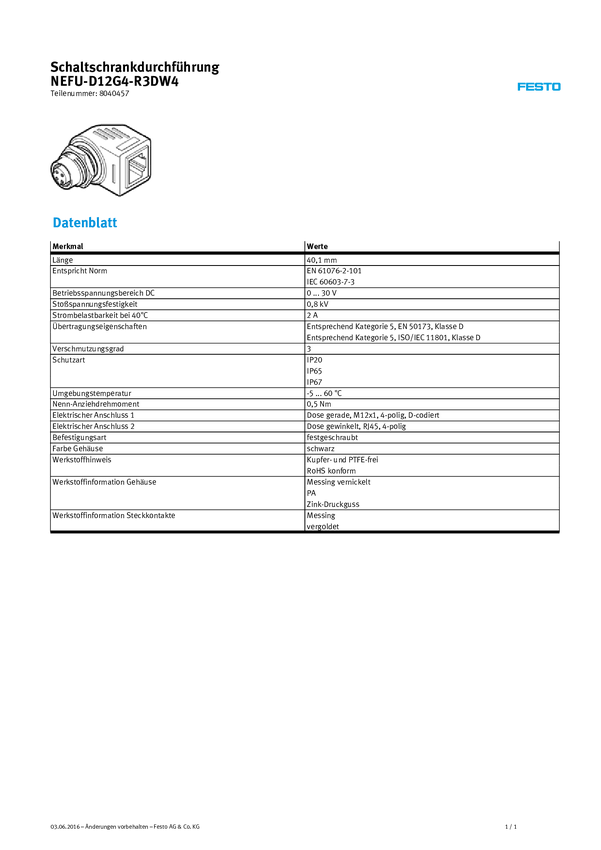 8040457 FESTO 8040457 Tuleja szafy sterowniczej NEFU-D12G4-R3DW4, piny: 4, 1 szt.