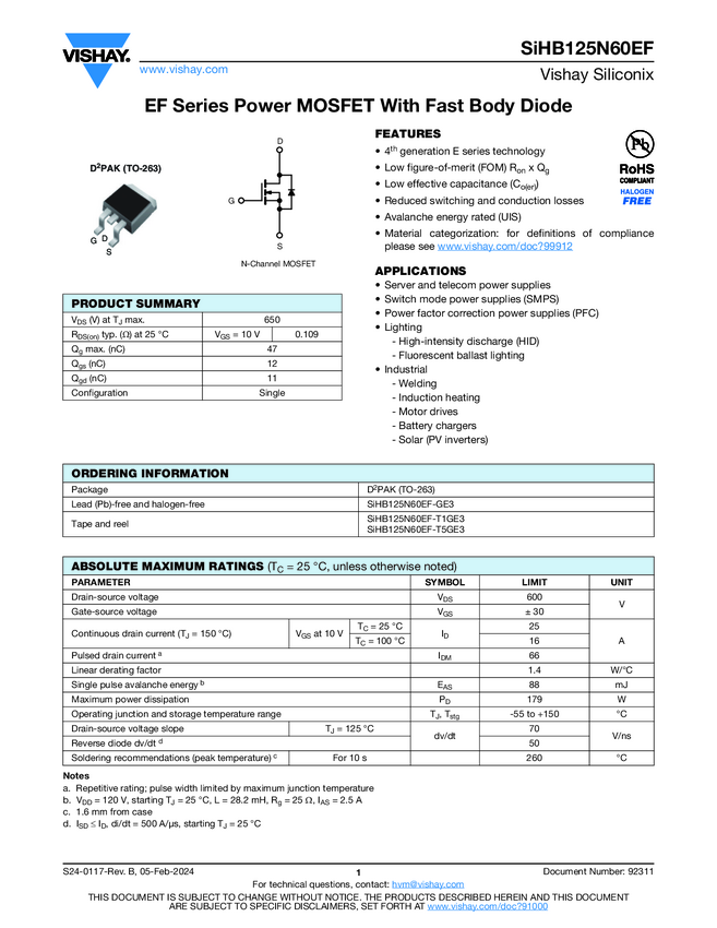 SiHB125N60EF EF Series Power MOSFET With Fast Body Diode