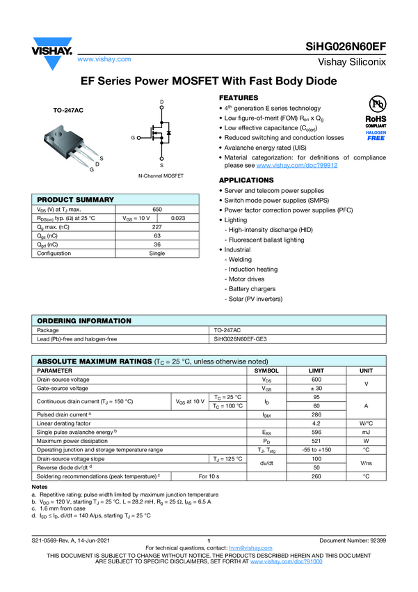SiHG026N60EF EF Series Power MOSFET With Fast Body Diode