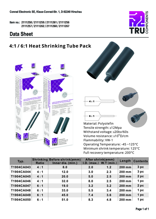 T1904CA048 Rurka termokurczliwa z klejem TRU COMPONENTS T1904CA048 Współczynnik skurcz...