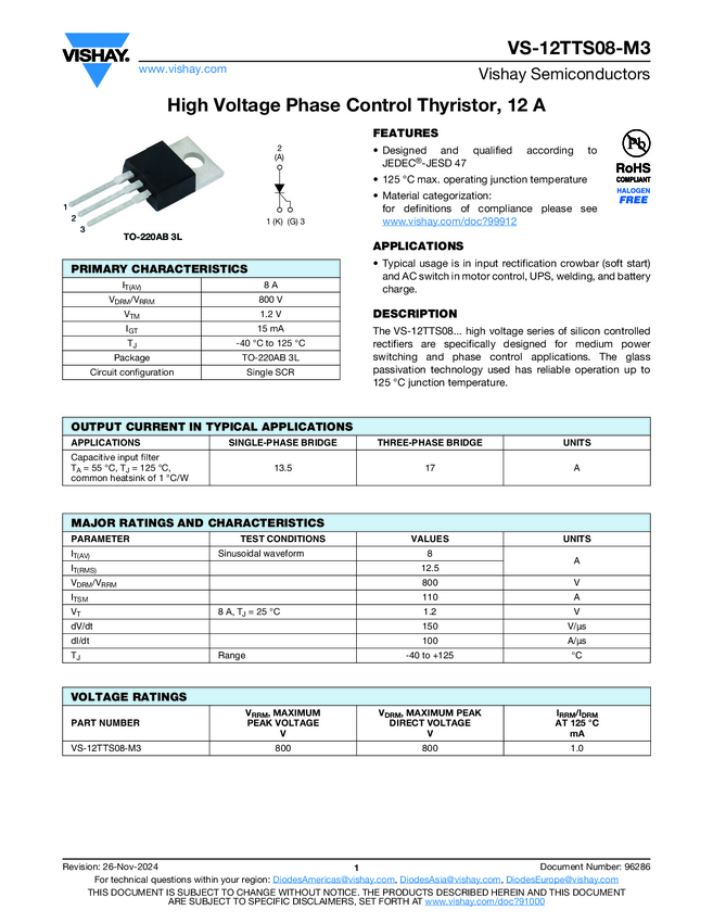 VS-12TTS08-M3 High Voltage Phase Control Thyristor, 12 A