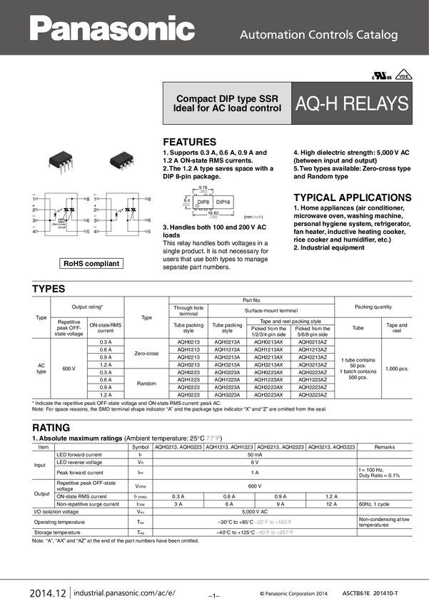 Przekaźnik; półprzewodnikowy; AQH2213; 6V DC; 50mA; 900mA; 600V AC: 1-fazowy; DIP8; THT; Panasonic; AQH2213; RoHS