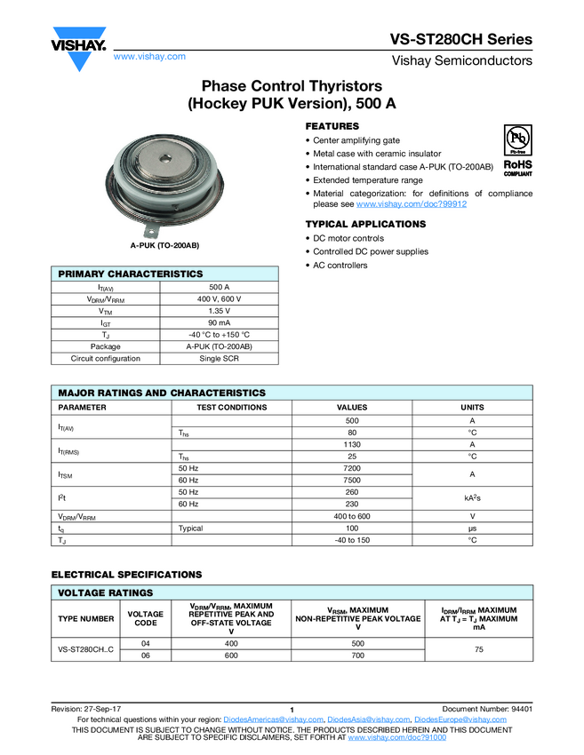VS-ST280CH Series Phase Control Thyristors (Hockey PUK Version), 500 A