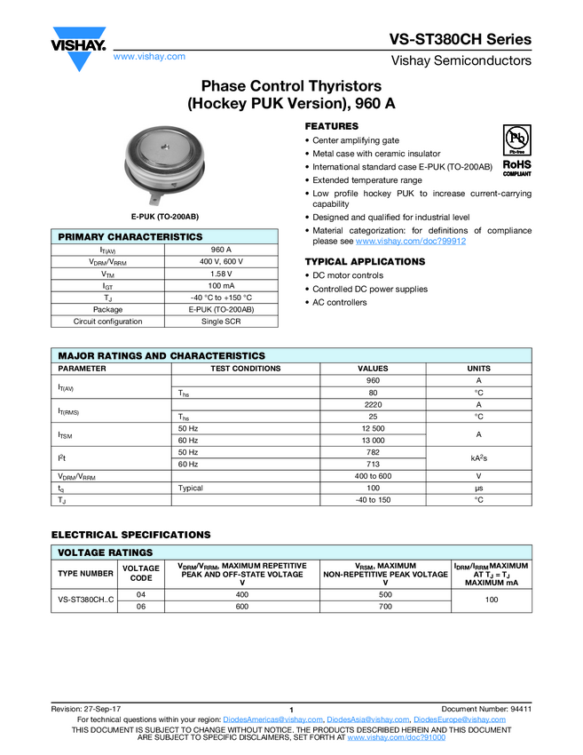 VS-ST380CH Series Phase Control Thyristors (Hockey PUK Version), 960 A