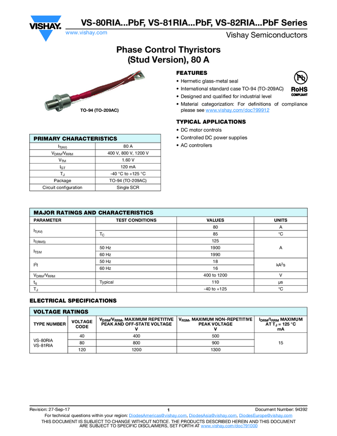 VS-81RIA...PbF Phase Control Thyristors (Stud Version), 80 A