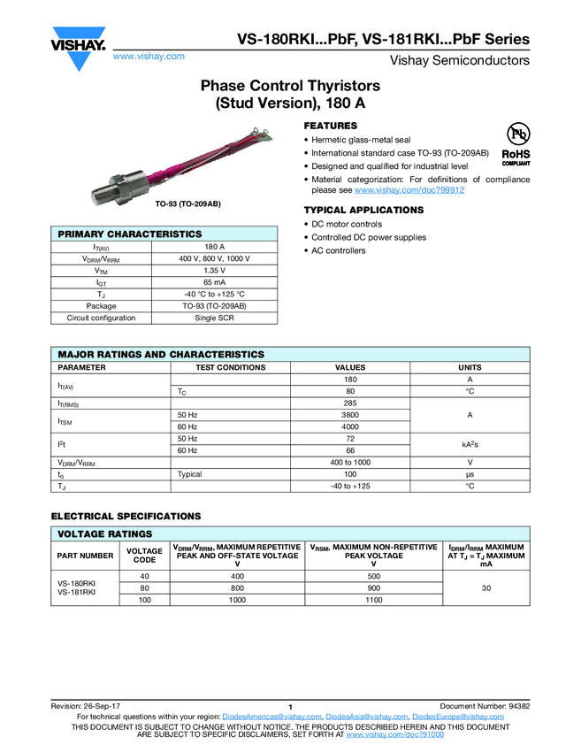 VS-180RKI...PbF Phase Control Thyristors (Stud Version), 180 A