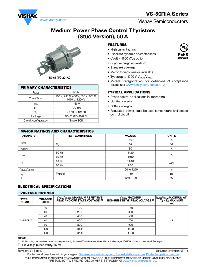 VS-50RIA Series Medium Power Phase Control Thyristors (Stud Version), 50 A