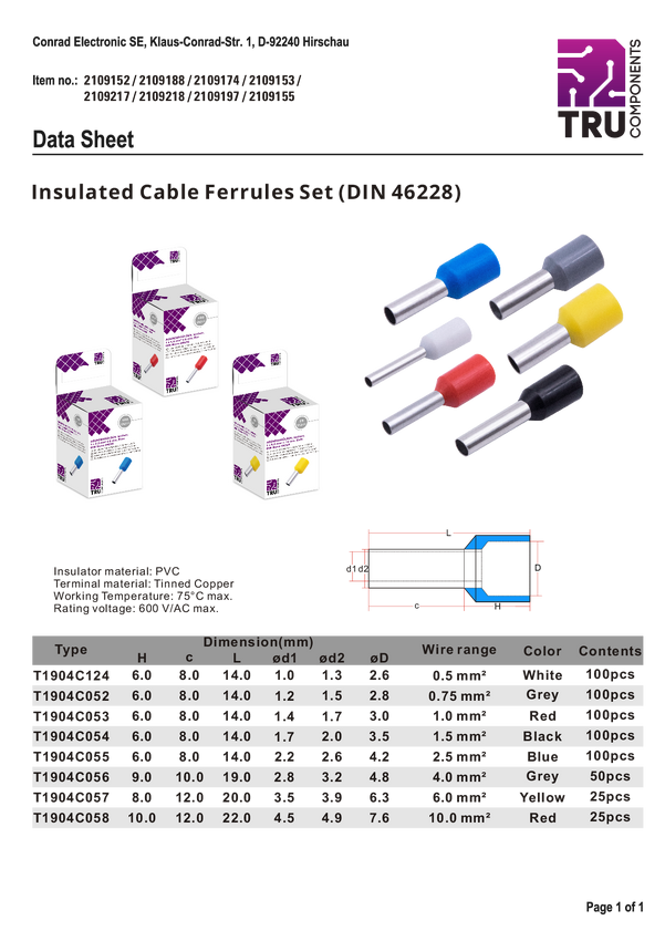 T1904C057 TRU COMPONENTS T1904C057 Końcówka rurkowa, z częściową izolacją , 6 mm² x...