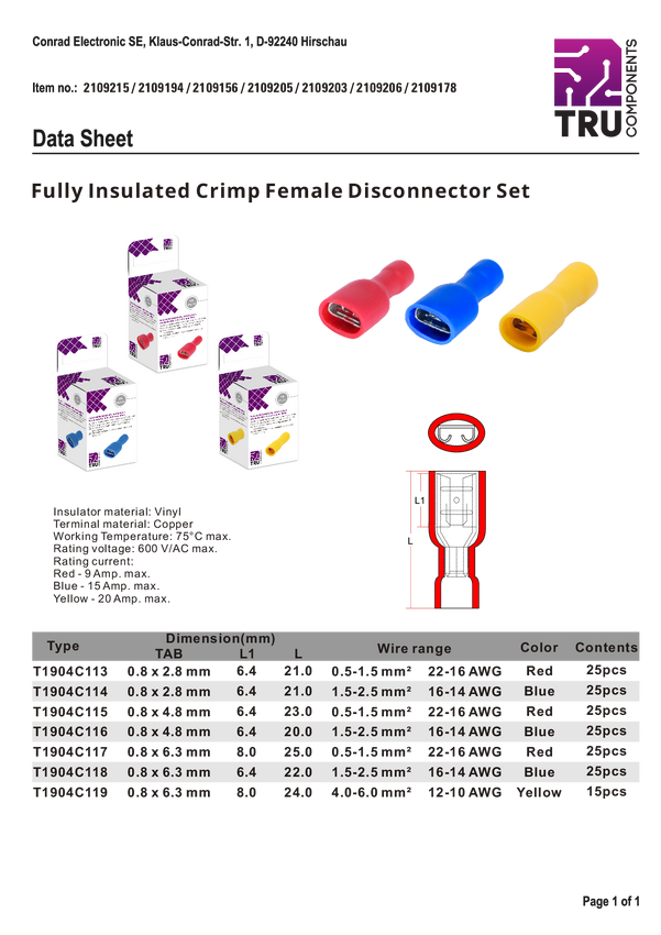 T1904C116 TRU COMPONENTS T1904C116 Asortyment konektorów płaskich, żeńskich 25 szt.