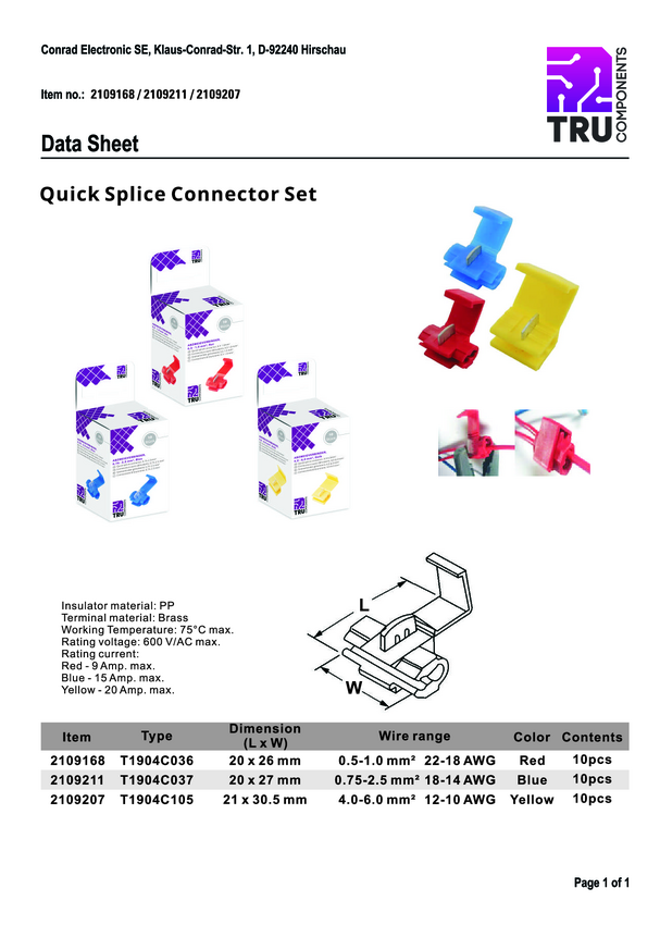 TRU COMPONENTS T1904C036 Złącze rozgałęziające, PIN: 2, 600 V, 9 A, 10 szt.