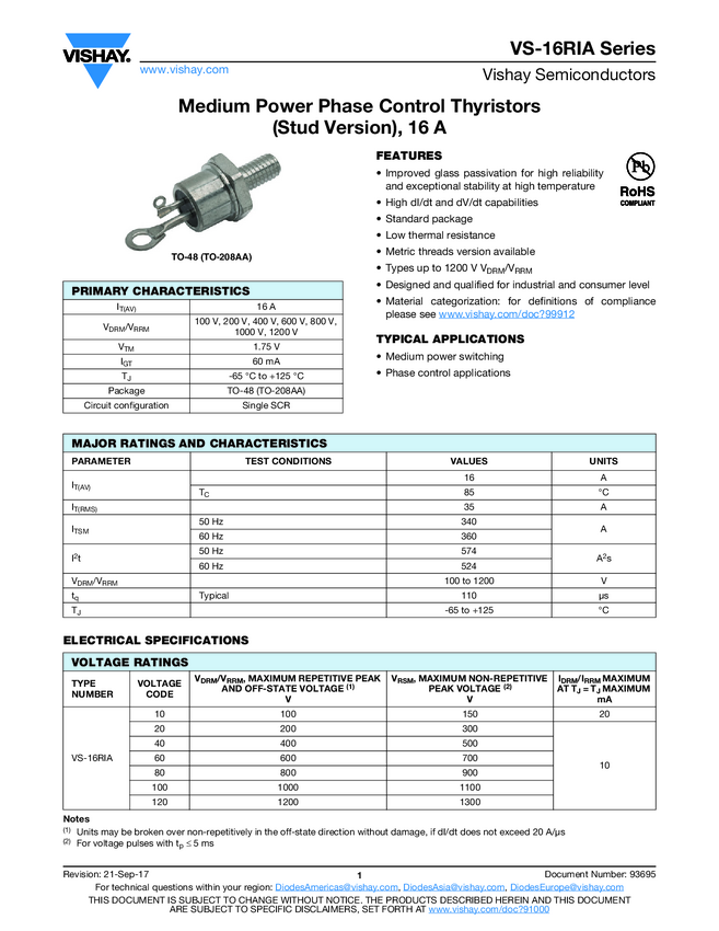 VS-16RIA Series Medium Power Phase Control Thyristors (Stud Version), 16 A