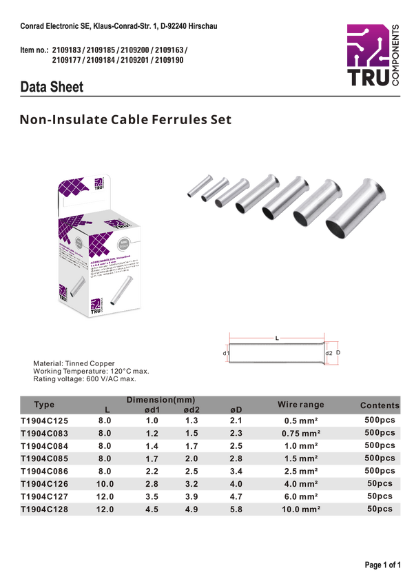 TRU COMPONENTS T1904C086 Końcówka rurkowa, bez izolacji, 2.5 mm² x 8 mm, 500 szt.