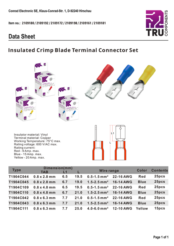 T1904C045 TRU COMPONENTS T1904C045 Złącze męskie płaskie, zestaw 25 szt.