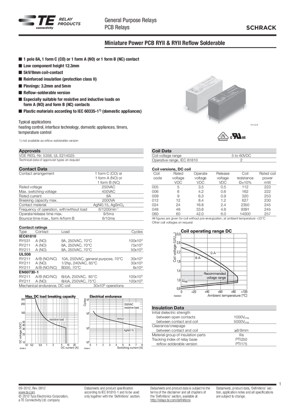 Przekaźnik; elektromagnetyczny; RY612024; 24VDC; 8A/250VAC; SPDT 1 styk przełączny; TE Connectivity; 2-1393225-9; RoHS