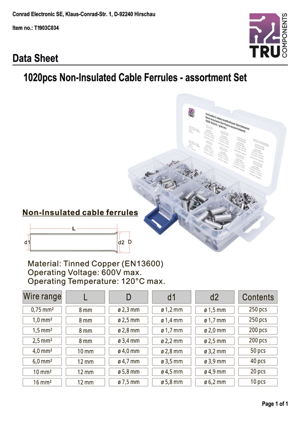 TRU COMPONENTS T1903C034 Zestaw końcówek rurkowych, bez izolacji, 0.75 mm², 1020 części