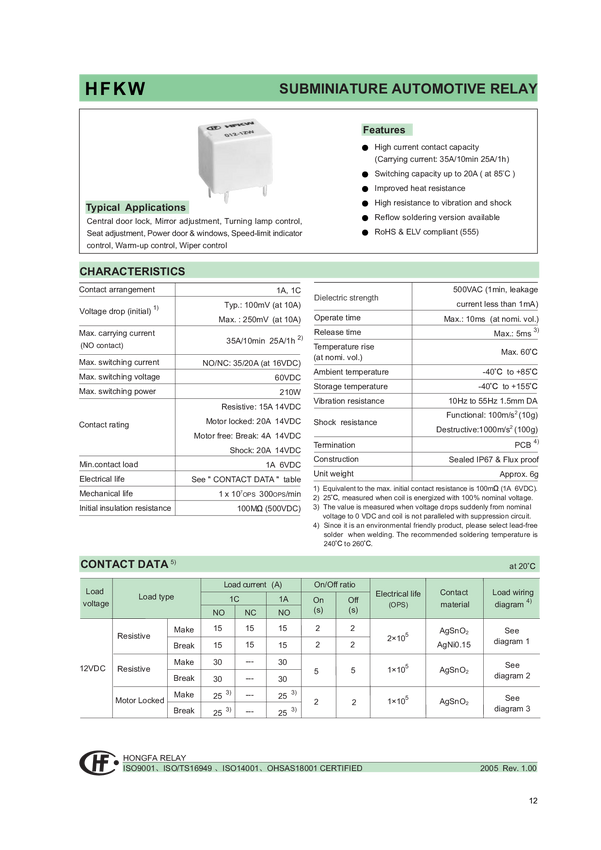 HFKW-012-1ZW Przekaźnik; HFKW-012-1ZW; elektromagnetyczny; samochodowy; 12V DC; 1 styk p...