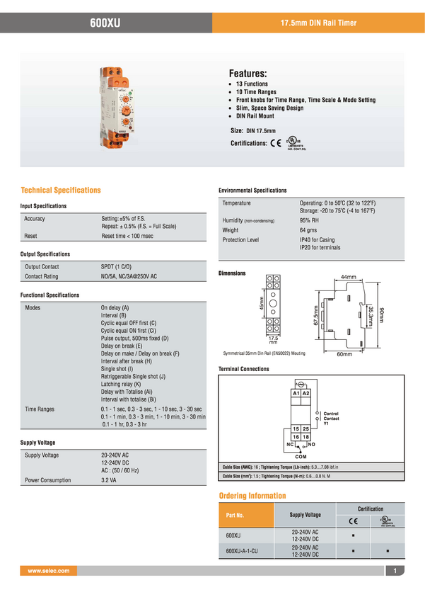 Przekaźnik; czasowy; 600XU-A-1; 20÷240V; AC/DC; wielofunkcyjny; SPDT 1 styk przełączny; 5A; 250V AC; 24V DC; 5A; na szynę DIN; Selec; RoHS