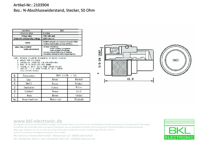 0404053 Złącze N BKL Electronic 0404053 0404053 rezystor końcowy 50 Ω 1 szt.