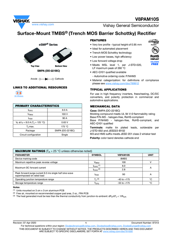 V8PAM10S Surface-Mount TMBS® (Trench MOS Barrier Schottky) Rectifier