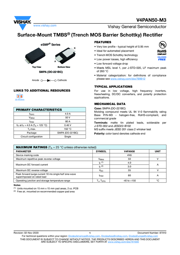 V4PAN50-M3 Surface-Mount TMBS® (Trench MOS Barrier Schottky) Rectifier