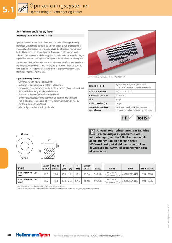 Etykiety do drukarki termotransferowej HellermannTyton TAG138LA4-1105-WHCL-1105-CL/WH 594-13876, montaż: przyklejanie, 1