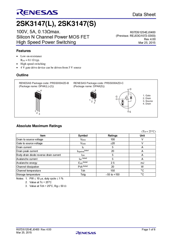2SK3147L Nch Single Power Mosfet 100V 5A 130Mohm DPAK(L)-(2)/To-251
