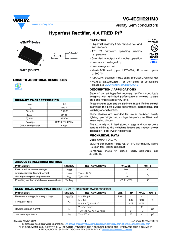 VS-4ESH02HM3 Hyperfast Rectifier, 4 A FRED Pt®
