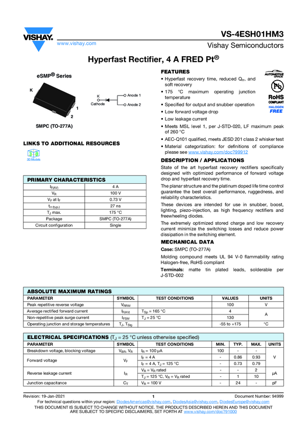 VS-4ESH01HM3 Hyperfast Rectifier, 4 A FRED Pt®