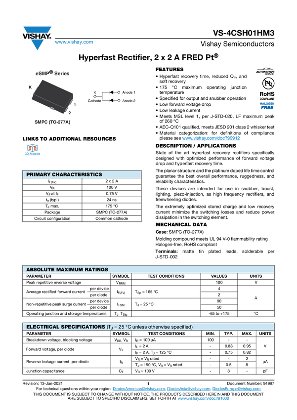 VS-4CSH01HM3 Hyperfast Rectifier, 2 x 2 A FRED Pt®